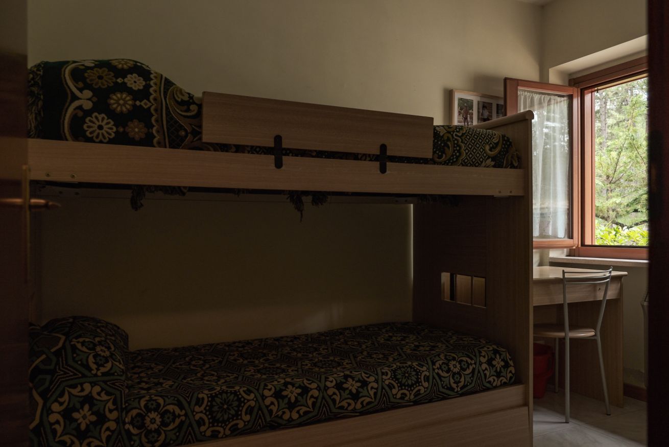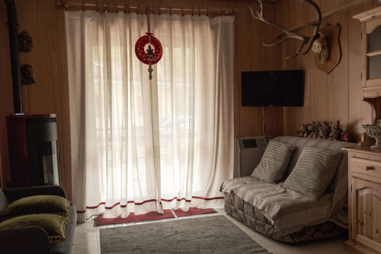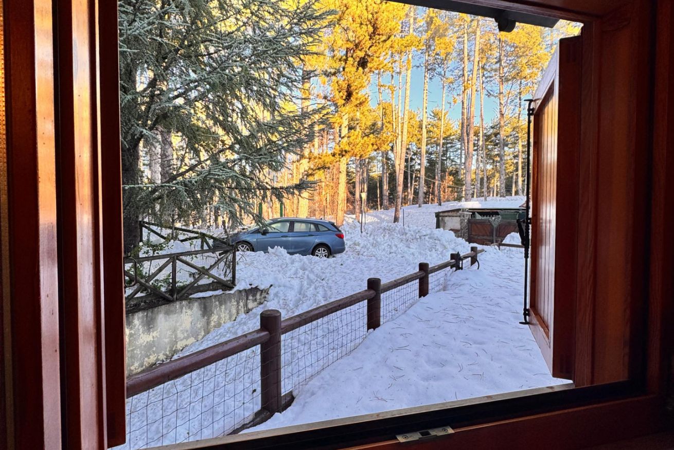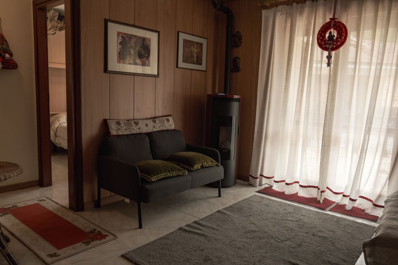 L’appartamento si affaccia su una pineta suggestiva, abitata da scoiattoli neri dal petto bianco che spesso si possono osservare saltare tra i rami. Basta uscire nel giardino privato per ritrovarsi immersi nella natura e respirare la quiete della montagna.
